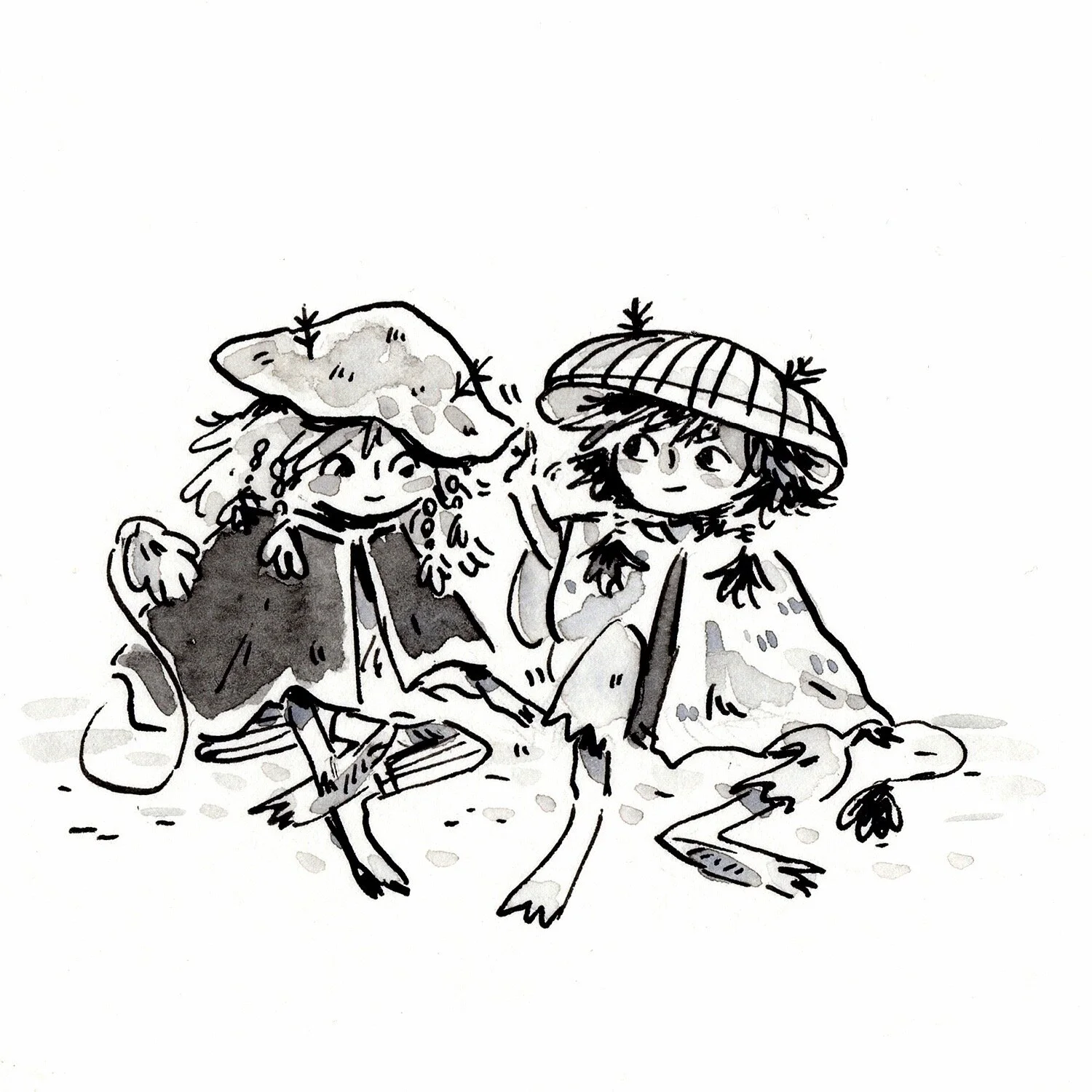 These are made with ink and watercolour, and feature the two main tree dweller characters, plus some of their family, squirrel beasts, a visiting moth and swift, mist creatures, and their fated mushroom enemies.